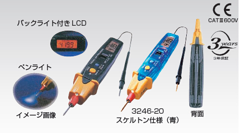 ● テストリードと本體が一體になったペンシル形のDMM ● Ω , 導通レンジはAC600V まで過電圧保護 ● 黒リード棒を背面に収納、本體先端を保護するキャップ付